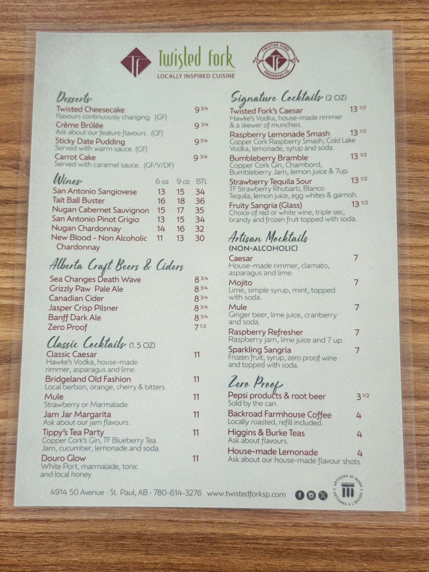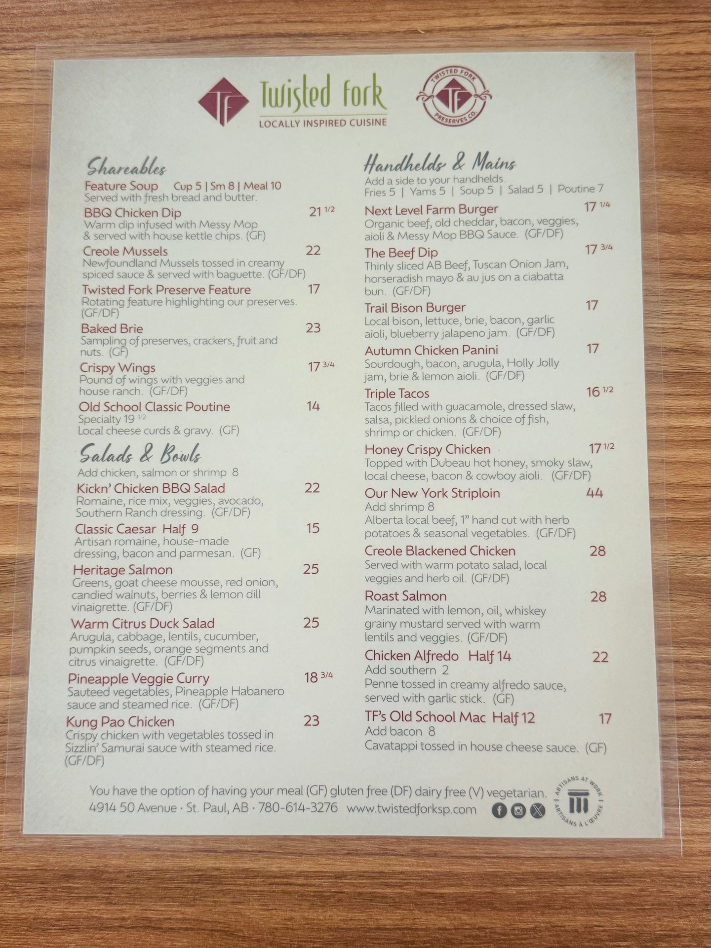 Twisted Fork restaurant in St. Paul, Alberta features locally inspired cuisine, with menus designed to fit products and flavours in season.